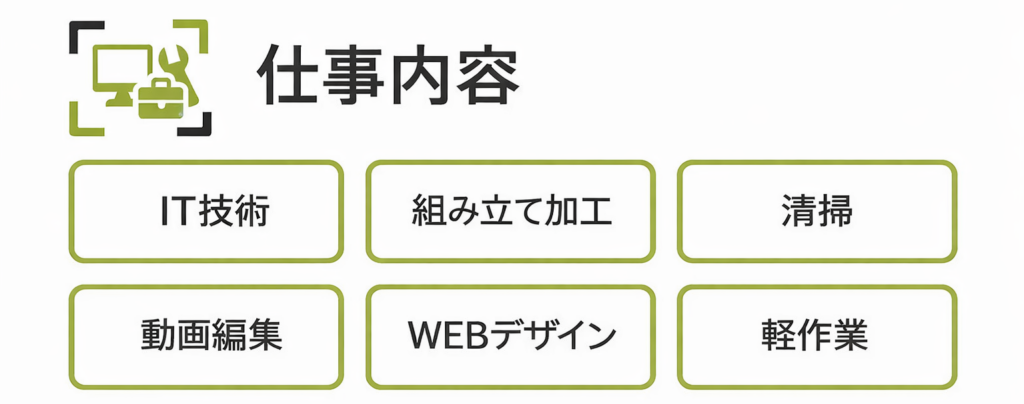 PCでの就労(Webサイト構築などのオンライン事業での作業)や、割り箸梱包、スポンジ梱包や検品、等の軽作業に始まり、清掃、運搬、運転、片付け、等、体力の回復や仕事への理解度、そして個人のレベル向上に伴った作業へと移行していく事が出来ました。