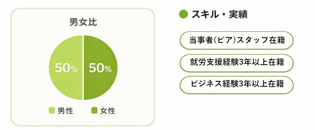 | 事業所の特徴 | 駅徒歩10分以内 / マイカー通所 / 車椅子受け入れ / 階段手すり / 休憩室 / 今すぐ利用可 / 週1利用可 / 体験利用可 / まずは相談可 / 見学可 / オンライン面談可能 / 1日5時間以上利用可 / 駅徒歩5分以内 / 筆談可能 / 電話配慮 / 作業マニュアルあり / 透析配慮 / スロープ設置 / 拡大鏡使用可能 / バリアフリートイレあり / グループホーム併設 / 自立訓練(生活訓練)併設 / 就労定着支援併設 / 定期面談/カウンセリング / 静かなオフィス環境 / 在宅勤務(リモートワーク)相談可能 |